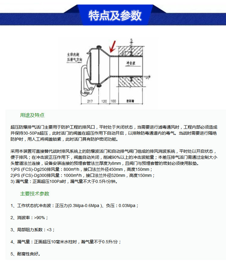 PS-250超压排气活门用于各级人防工事,作为超压排气用,其目的是为了保持室内一定的超压,当室内差压消失时,活门自动关闭。